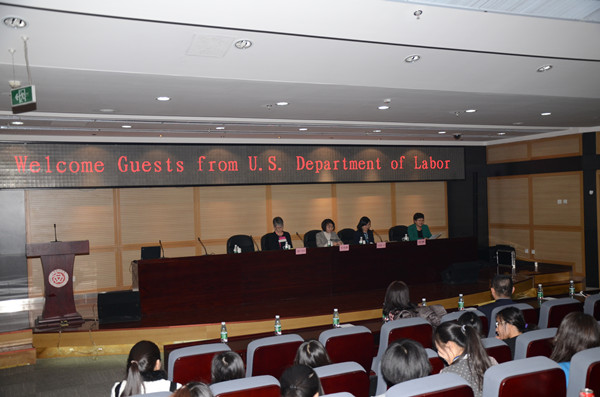 2014年12月9日下午,美国劳工部就业与职业培训事务局助理部长吴俞蓉(Portia Wu)女士和助理部长帮办特雷莎·葛尔顿(Teresa W. Gerton)女士一行来访我校,就“女性成长与个人职业发展”与我校学生进行了分享交流。