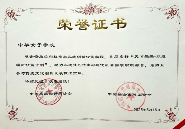 本次毕业季,我院学子不仅在毕业大秀上大放异彩,更在多项权威赛事中捷报频传,硕果累累,以优异成绩为国家级一流专业建设递交完美答卷。中华女子学院斩获“2025中国国际大学生时装周人才培养成果奖”;助力“天才妈妈-非遗焕新公益计划”获贡献奖。