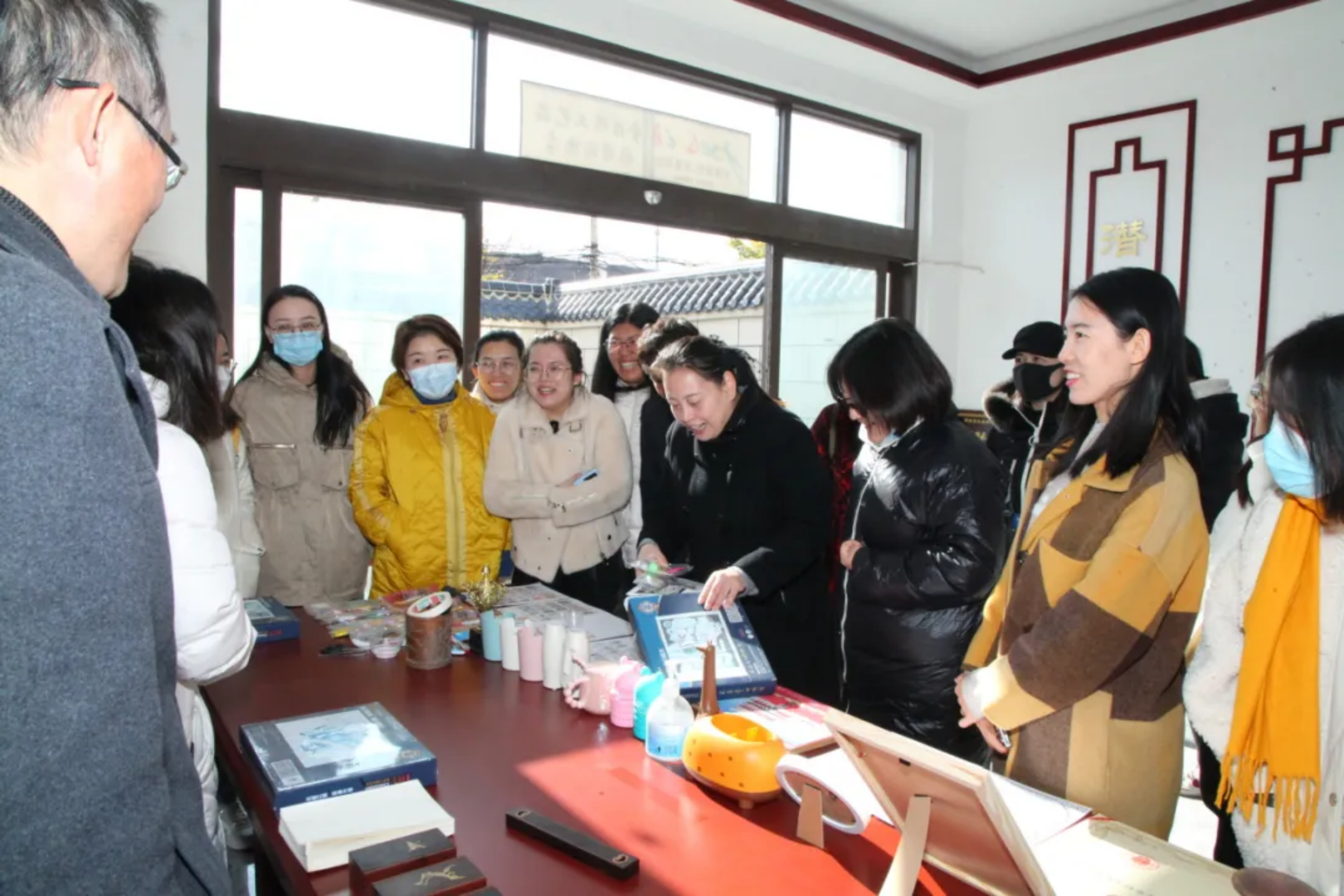 在巧手脱贫基地、妇联执委工作站(燕京景泰蓝艺社),调研团队了解妇女脱贫致富、建功立业的事迹和经验。三河市妇联执委、工艺社总经理、廊坊市级非遗代表性传承人张金香,为大家讲解景泰蓝工艺和工坊所获得的艺术成就。教师们现场观摩掐丝工作室和上釉工作室妇女工作者们制作景泰蓝工艺的过程,参观景泰蓝艺术品展览。大家对景泰蓝工艺品展现出高度的热情,惊讶于工艺的精美与匠人们超高的制作技艺,也为妇女工作者专注执着的工匠精神点赞。